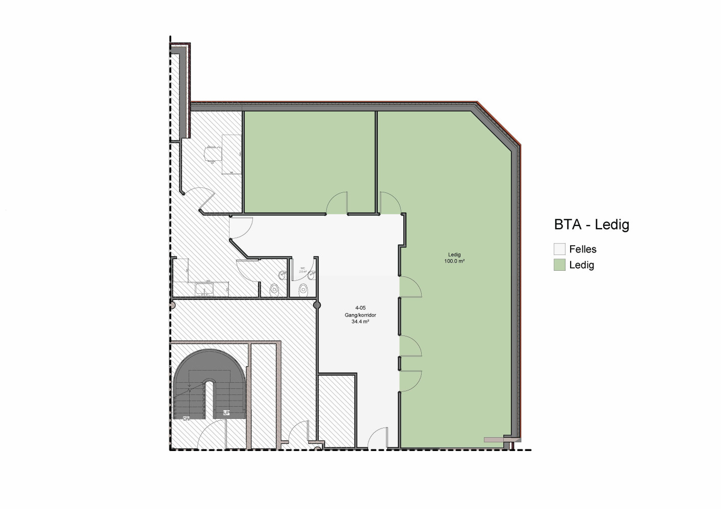 Bruttoareal ekslusivt (BTA-E). Plasseffektivitet vil variere fra eiendom til eiendom. Arbeidstilsynets forvaltningspraksis legger til grunn at hver arbeidsplass skal ha et gulvareal på minst 6 m2, store statlige aktører opererer ofte med høyere krav.